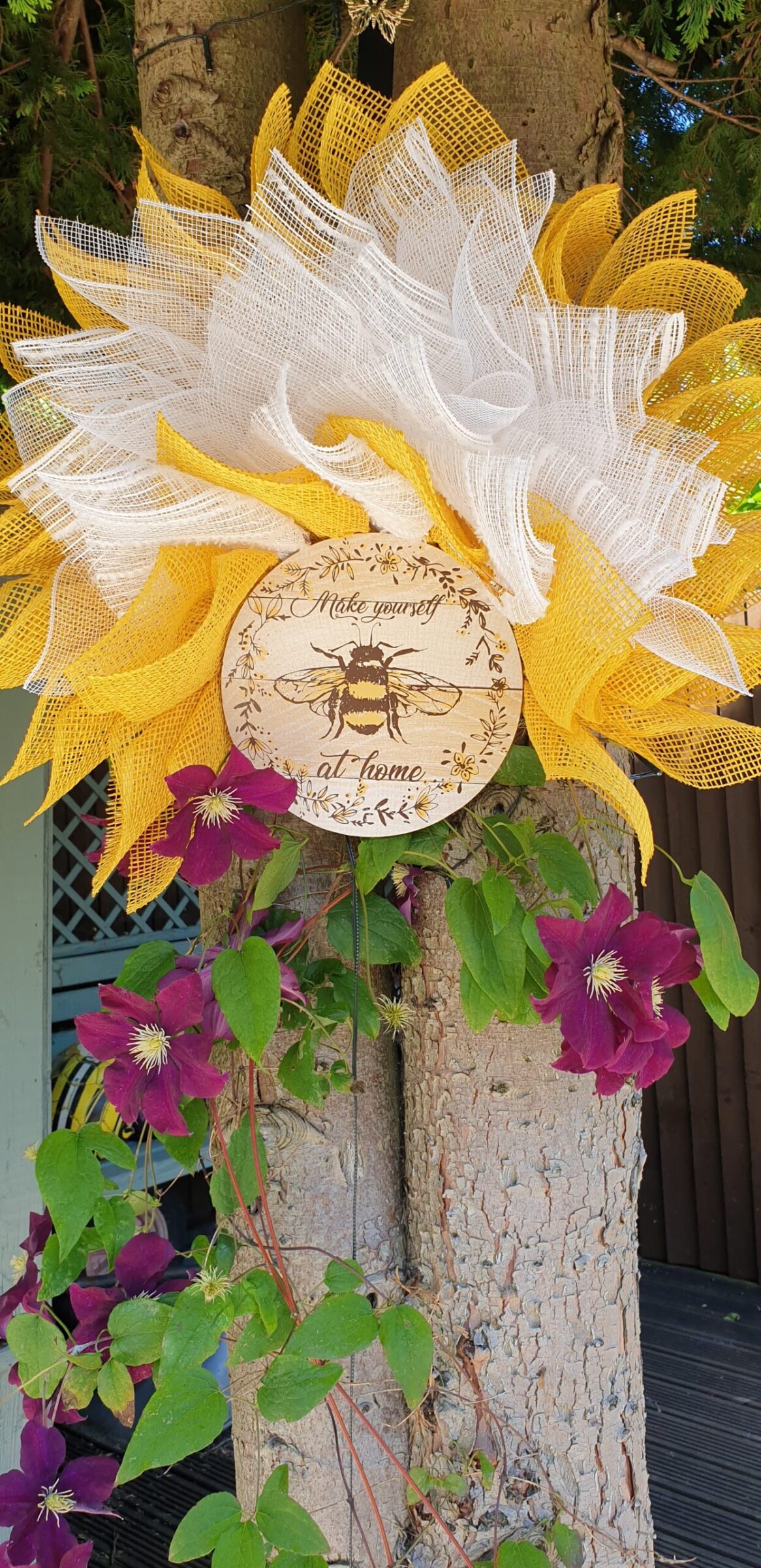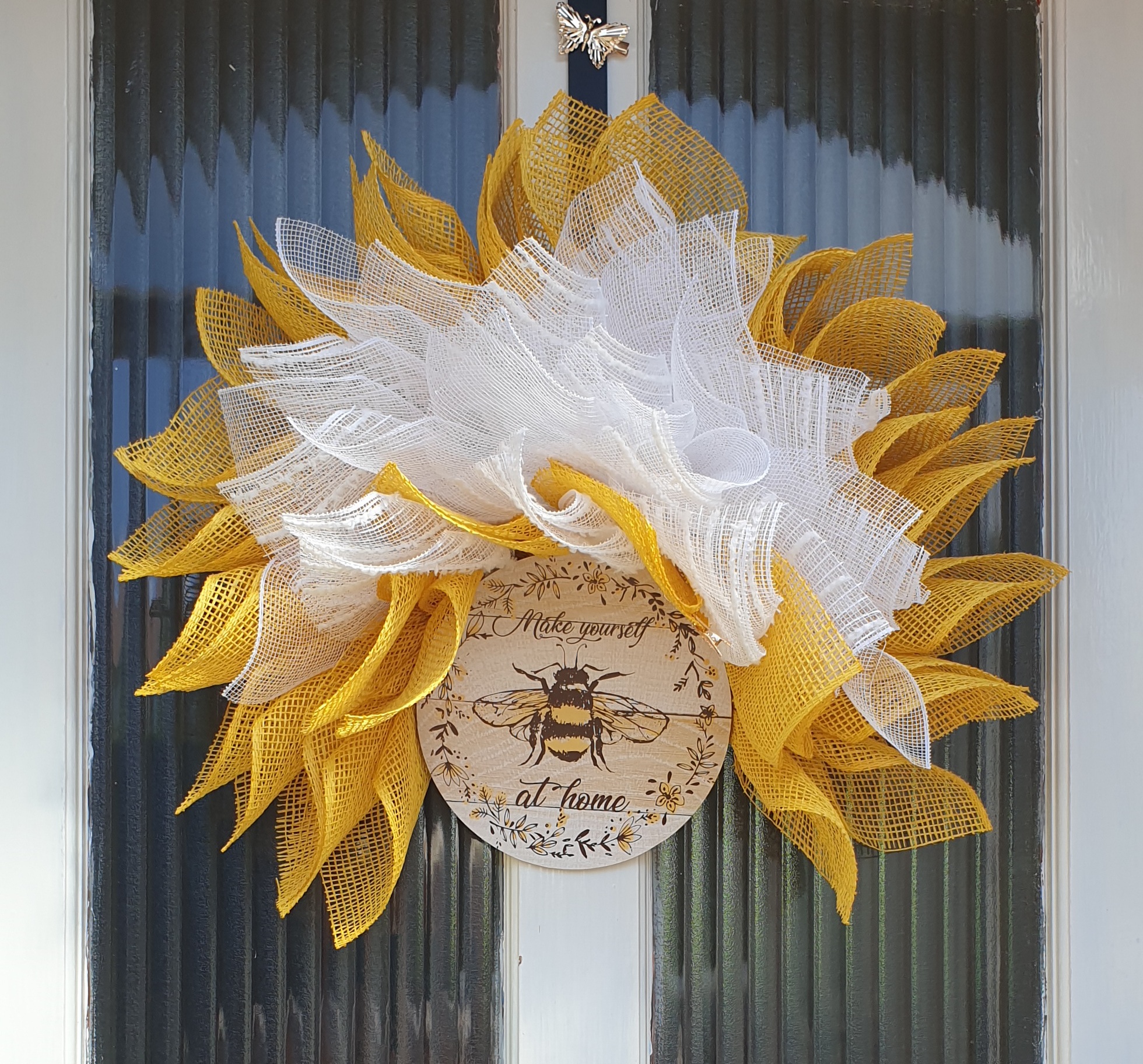 This BEEautiful handmade ” Summer Inspired ” wreath would look fabulous almost anywhere in the home and garden any time of year .. This is a 3D effect sunflower design made up from stiff yellow poly burlap – a white snowball striped poly burlap and mixed with a white pearlized stripe poly mesh in the center to give it the fullness and 3D dimension. This particular design is finished with an 8 inch wooden disc adorned with the loveliest Bee design including the phrase ” MAKE YOURSELF AT HOME “